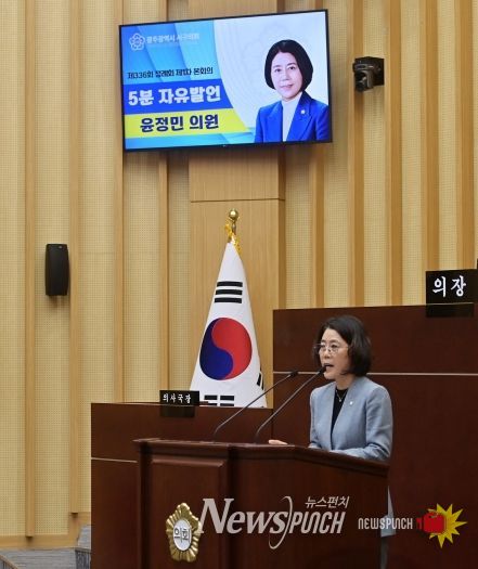 뉴스펀치 김길룡 기자 | 서구의회 윤정민 의원(상무2동·서창동·금호1·2동)은 25일 열린 제336회 제2차 정례회 본회의 5분자유발언에서 “구민의 편의와 안전이 행정의 최우선 기준이 되어야 한다”고 강조하며, 마륵공원 전기차 충전시설 이전과 도로 개설 지연 문제에 대한 신속한 대책 마련을 촉구했다.