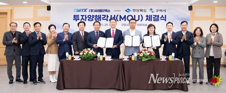 뉴스펀치 김길룡 기자 | 경상북도와 구미시는 25일 구미시청 3층 대회의실에서 양금희 경상북도 경제부지사, 김장호 구미시장, 박교상 구미시의회 의장, 박성훈 ㈜씨엠티엑스 대표이사 등이 참석한 가운데 ㈜씨엠티엑스와 경상북도·구미시 간 투자양해각서(MOU)를 체결했다.