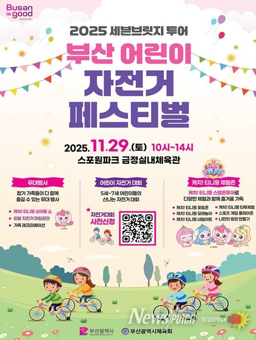 뉴스펀치 김길룡 기자 | 부산시는 오는 11월 29일 오전 11시 스포원파크 금정실내체육관에서 2025 세븐브릿지 투어 연계 '부산 어린이 자전거 페스티벌'을 개최한다고 밝혔다.
