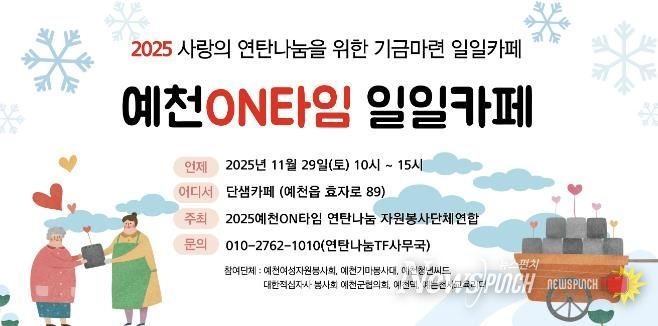 뉴스펀치 김길룡 기자 | 예천ON타임 연탄나눔 자원봉사연합은 오는 29일, 오전 10시부터 오후 3시까지 단샘카페(효자로 89)에서 연말 취약 계층에게 전할 연탄 기부금을 마련하기 위해 ‘일일카페’를 운영한다.