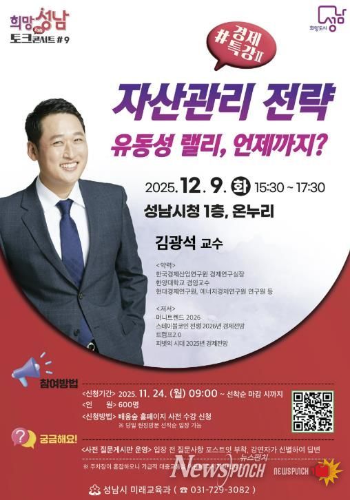 뉴스펀치 김길룡 기자 | 성남시는 오는 12월 9일 오후 3시 30분~5시 30분 시청 1층 온누리에서 ‘자산관리 전략’을 주제로 한 올해 희망성남 토크콘서트 마지막 강연을 연다.