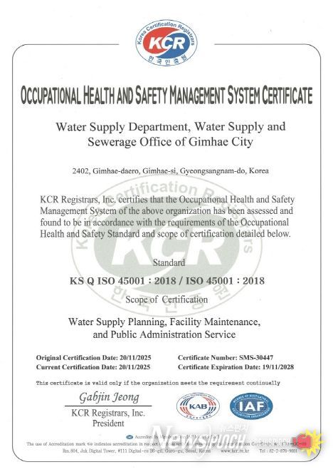 뉴스펀치 김길룡 기자 | 김해시는 상수도 분야에서 안전보건 국제표준인 ISO 45001(안전보건경영시스템) 인증을 취득했다고 26일 밝혔다.