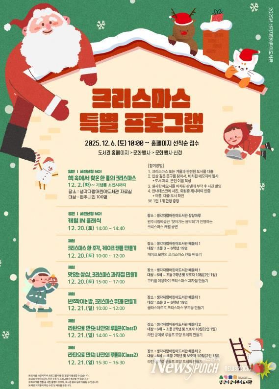 뉴스펀치 김길룡 기자 | 원주시 생각자람어린이도서관은 오는 12월 2일부터 21일까지 어린이와 가족을 위한 ‘크리스마스 특별 프로그램’을 운영한다.