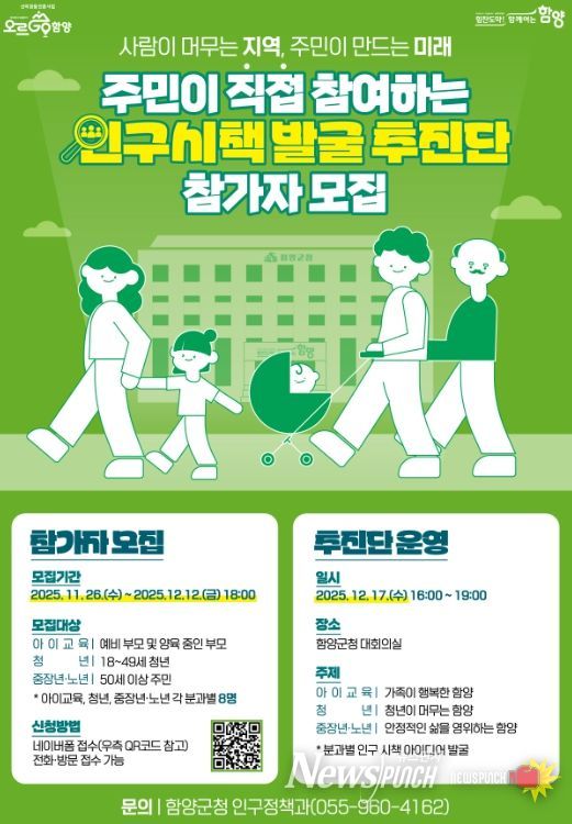 뉴스펀치 김길룡 기자 | 함양군은 ‘주민이 직접 참여하는 인구시책 발굴 추진단’ 운영을 위해 11월 26일부터 12월 12일까지 군민 참여자를 모집한다고 밝혔다.