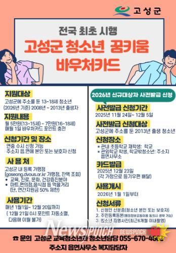 뉴스펀치 김길룡 기자 | 고성군은 지난 25일, 2026년 청소년 꿈키움 바우처 신규 대상자의 카드 사전발급을 위해 11월 24일부터 12월 5일까지 집중신청 기간을 운영한다고 밝혔다.