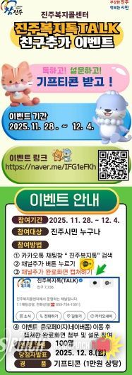 이벤트 응모 방법은 ‘진주복지톡’ 채널에 친구를 추가한 뒤, 채널 추가 인증사진을 응모 페이지에서 등록하고, 설문을 작성하는 방식이다. 이벤트 참여자를 무작위 추첨해 기프티콘(1만 원 상당)을 증정하며, 당첨자는 12월 8일 발표할 예정이다.