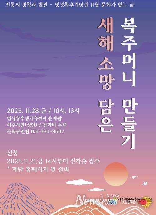 뉴스펀치 김길룡 기자 | 여주세종문화관광재단은 오는 11월 28일, 명성황후기념관 11월 문화가 있는 날 프로그램으로‘새해 소망 담은 복주머니 만들기’를 진행한다.