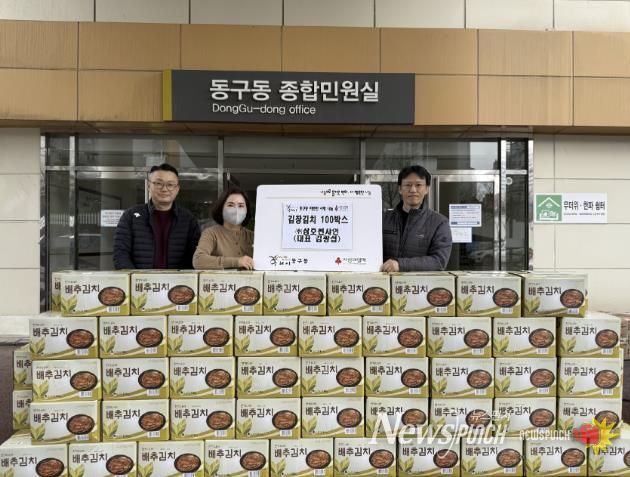 뉴스펀치 김길룡 기자 | 구리시 동구동 행정복지센터는 지난 25일 동구동 행정복지센터에서 ㈜삼호썬샤인으로부터 겨울철 취약계층을 위한 김장 김치 100박스를 기탁받았다고 밝혔다.