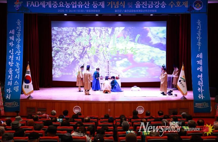 뉴스펀치 김길룡 기자 | 울진군은 세계가 인정한 울진 금강송의 가치를 군민과 함께 공유하고 보전 의지를 다지기 위해 개최한‘울진금강송산지농업시스템’ FAO 세계중요농업유산(GIAHS) 등재 기념식 및 제15회 울진금강송 수호제를 11월 26일 근남면 왕피천공원 문화관에서 성황리에 마무리했다.