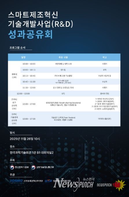 뉴스펀치 조평훈 기자 | 과학기술정보통신부는 중소벤처기업부와 함께 중소기업의 지능형 제조(스마트제조) 역량 고도화를 지원하기 위해 추진 중인 ‘지능형 제조(스마트제조) 혁신 기술 개발’ 사업의 성과를 공유하고, 제조 현장 확산을 위한 성과공유회를 11월 26일 한국과학기술회관에서 공동으로 개최할 예정이라고 밝혔다.