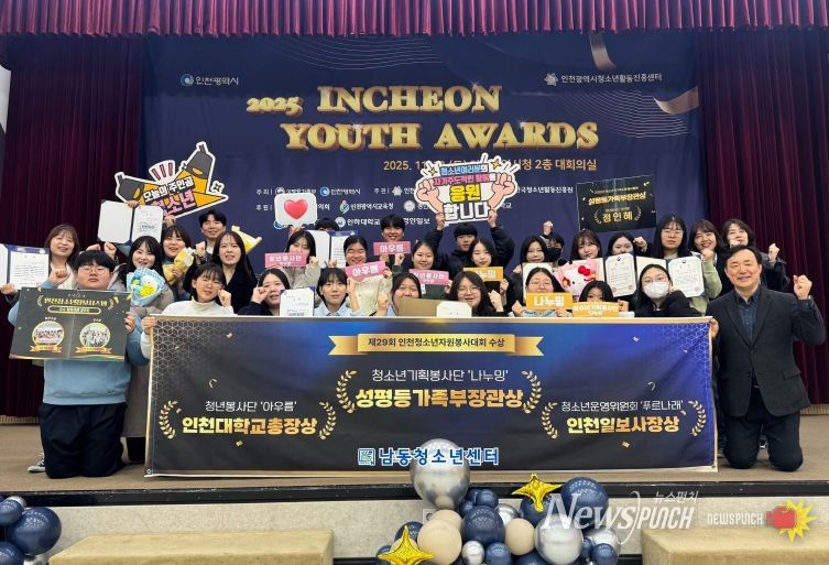뉴스펀치 김길룡 기자 | 인천시 남동구 남동청소년센터는 소속 청소년 활동 참여‧자치기구가 인천시청에서 열린 ‘2025년 우수 청소년 활동 시상식(인천 유스 어워즈)’에서 성평등가족부 장관상을 포함해 총 8개 부문에서 수상했다고 26일 밝혔다.