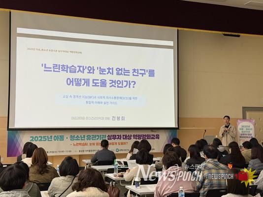 뉴스펀치 김길룡 기자 | 김해시정신건강복지센터는 26일 동상동 다어울림센터에서 ‘느린학습자, 눈치없는 친구 어떻게 도울까?’라는 주제로 관내 아동·청소년 관련 기관 종사자 및 학교 상담(교)사 역량강화교육을 실시했다.