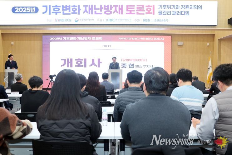 뉴스펀치 김길룡 기자 | 강원특별자치도는 11월 26일 춘천ICT벤처센터 컨퍼런스룸에서 도민, 시민단체, 관계 공무원 등 100여 명이 참석한 가운데 ‘기후위기와 강원지역 물관리의 패러다임’을 주제로 '2025년 기후변화 재난방재 토론회'를 개최했다고 밝혔다.