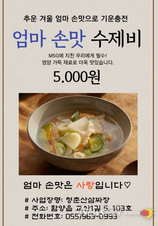 뉴스펀치 김길룡 기자 | 함양시니어클럽의 노인일자리 공동체사업단 ‘청춘산삼짜장’이 겨울철을 맞아 ‘엄마 손맛 수제비’를 신메뉴로 개발하고 25일 시식회를 거쳐 본격적인 판매에 나선다고 밝혔다.