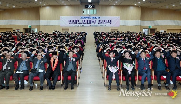 뉴스펀치 김길룡 기자 | 대한노인회 밀양시지회(지회장 신준철) 26일 시청 대강당에서 2025년 제20기 밀양노인대학 졸업식을 성황리에 개최했다.