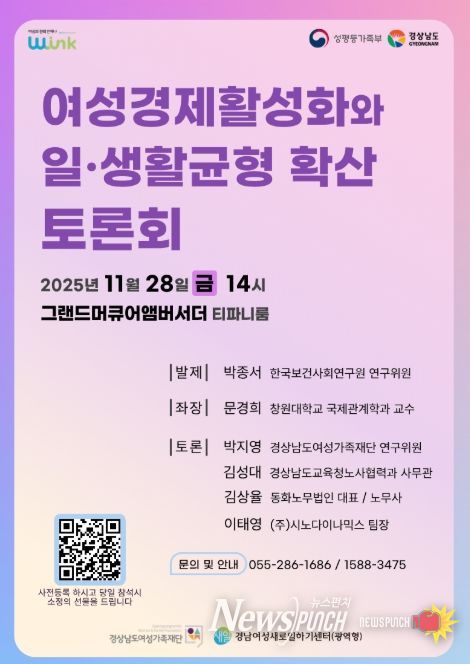 뉴스펀치 김길룡 기자 | 경상남도는 28일 오후 2시 창원 그랜드머큐어앰배서더 티파니룸에서 ‘여성 경제 활성화와 일·생활균형 확산 토론회’를 개최한다고 밝혔다.