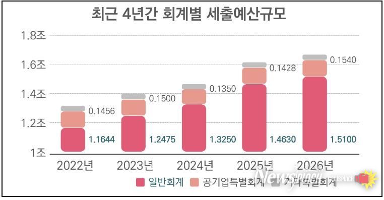 회계별 세출예산 규모를 살펴보면 일반회계는 1조 1,644억 원에서 1조 5,100억 원으로 3,456억 원(29.7%) 늘어났고, 특별회계는 1,456억 원에서 1,540억 원으로 84억 원(5.8%) 증가했다.