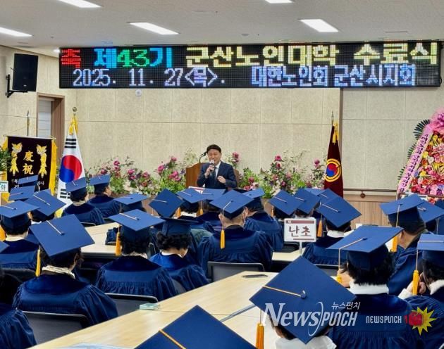 뉴스펀치 정홍균 기자 | 대한노인회 군산시지회가 주최한 ‘2025년 제43회 노인대학 수료식’이 27일 군산시 노인회관 3층 대강당에서 성황리에 개최됐다.