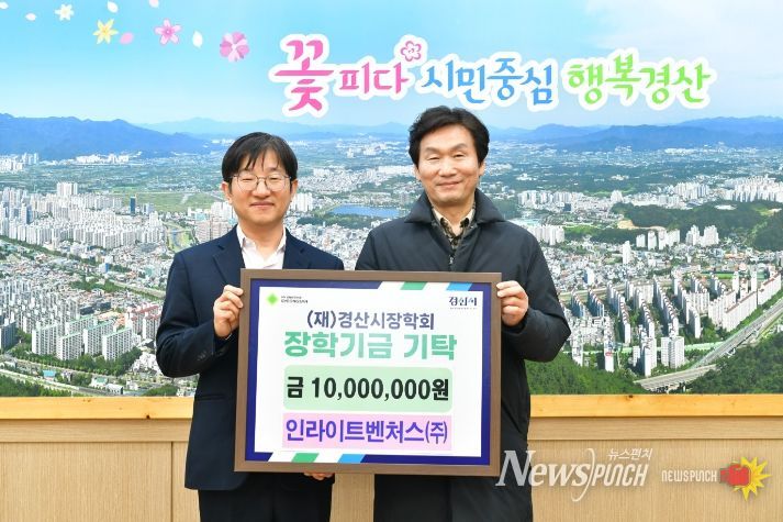 뉴스펀치 김길룡 기자 | 경산시는 25일 벤처투자회사 인라이트벤처스㈜(대표이사 박문수)가 장학금으로 1,000만 원을 기탁했다고 전했다.