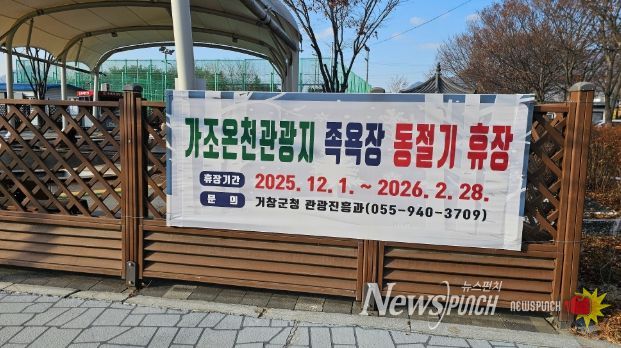 뉴스펀치 김길룡 기자 | 거창군은 오는 12월 1일부터 내년 2월 말까지 가조온천관광지 입구(가조면 일부리 1263)에 있는 족욕체험장을 동절기 휴장한다고 밝혔다.