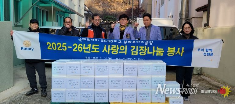 뉴스펀치 김길룡 기자 | 봉화로타리클럽(회장 원준석)은 11월 25일 (사)봉화군종합자원봉사센터(이사장 김병남)에 김장김치 50박스(150kg)을 전달했다. 이번 기탁은 겨울철을 앞두고 지역 내 취약계층과 소외이웃을 지원하기 위하여 마련됐다.