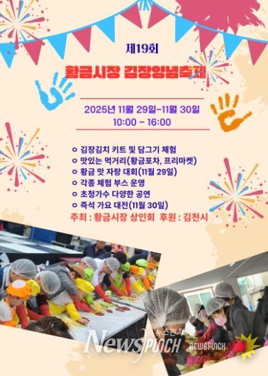 뉴스펀치 김길룡 기자 | 김천시에서는 오는 29일~30일 황금동 한신로 일원에서 ‘제19회 황금시장 김장양념축제’를 개최한다고 밝혔다.