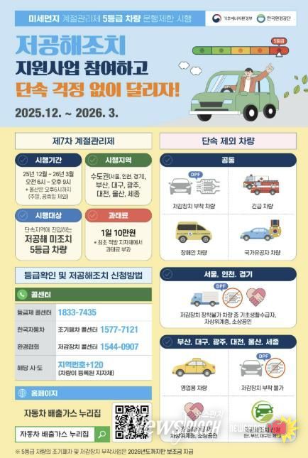 뉴스펀치 김길룡 기자 | 구리시는 12월부터 내년 3월까지 미세먼지 관리를 강화하고 시민 건강을 보호하기 위해 ‘제7차 미세먼지 계절 관리제’를 시행하며, 이 기간에 노후 경유차 배출가스 5등급 차량의 운행을 제한한다고 밝혔다.