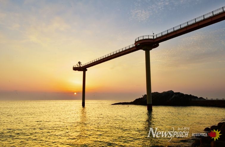 비단결 후포 바다를 가르며 존재감을 뿜어내는 후포 등기산 스카이 워크.그리고 비단결 후포 바다 위에 내린 새벽 첫 빛이 장관을 연출한다.