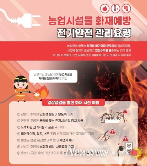 시설하우스는 구조상 전선과 장비가 밀집돼 있어 작은 전기 스파크도 화재로 확산될 위험이 크다. 특히 배전함 내부에 쌓인 먼지, 노후 배선, 과부하 상태의 전력 사용은 주요 위험요인으로 배전반 청소와 전선·차단기 점검이 우선적으로 이루어져야 한다.