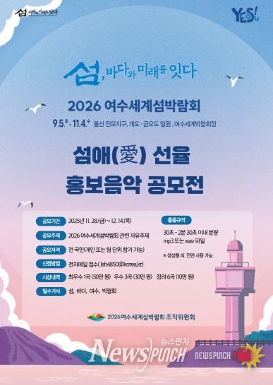 뉴스펀치 김길룡 기자 | (재)2026여수세계섬박람회조직위원회가 12월 14일까지 ‘2026여수세계섬박람회 섬애(愛)선율 음악 공모전’을 개최한다.