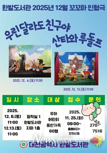 뉴스펀치 김길룡 기자 | 한밭도서관은 지역 어린이들에게 따뜻한 감성과 사회적 가치를 전하기 위해 두 가지 인형극 ‘우린 달라도 친구야’, ‘산타와 루돌프’를 공연한다.