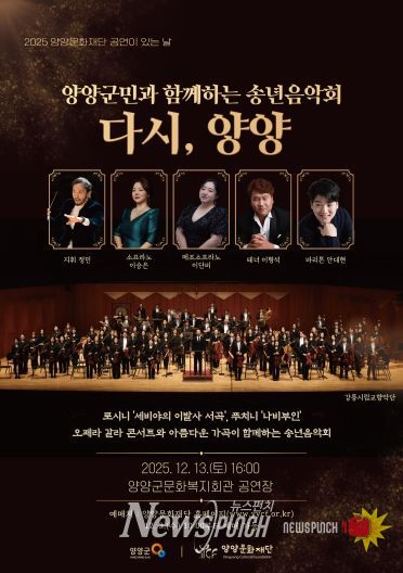뉴스펀치 김길룡 기자 | (재)양양문화재단은 오는 12월 13일 오후 4시, 양양군문화복지회관 공연장에서 정민 상임지휘자가 이끄는 강릉시립교향악단과 소프라노 이승은, 메조소프라노 이단비, 테너 이형석, 바리톤 안대현이 함께하는 '2025 양양군민과 함께하는 송년음악회 – 다시, 양양'을 개최한다.