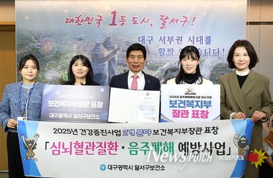 뉴스펀치 조평훈 기자 | 대구 달서구보건소가 음주폐해예방사업 우수사례 기관 표창과 심뇌혈관질환 예방관리 유공기관 표창에서 각각 보건복지부 장관상을 수상하며, 2개 부문 동시 수상이라는 성과를 거뒀다.