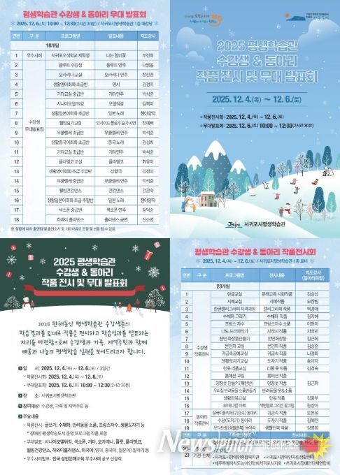뉴스펀치 김길룡 기자 | 서귀포시는 12월 4일부터 6일까지 평생학습관에서 수강생들이 한 해 동안 배우고 익힌 성과를 선보이는 ‘2025년도 서귀포시 평생학습관 수강생 작품전시회 및 무대발표회’를 개최한다.