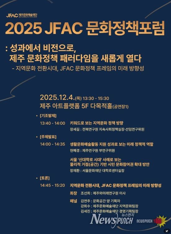 뉴스펀치 김길룡 기자 | 제주문화예술재단(이사장 김석윤)은 '다시 심는 성과, 피어나는 비전'이라는 슬로건으로 '2025년 재단 성과공유주간(이하 성과공유주간)'을 개최한다. 프로그램은 제주아트플랫폼(5층)에서 12월 4일부터 6일까지 3일간 진행된다.