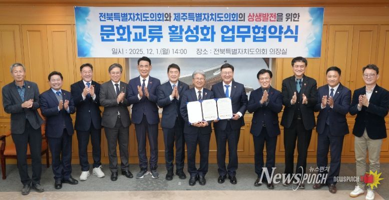 뉴스펀치 김길룡 기자 | 전북특별자치도의회와 제주특별자치도의회는 문화·관광·세계유산 분야 협력을 강화하기 위해 1일 전북도의회 의장실에서 문화교류 활성화 업무협약(MOU)을 체결했다.