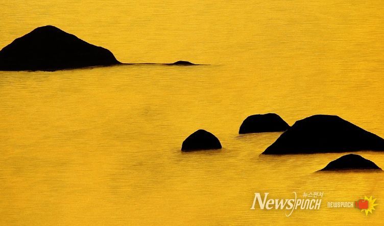 이번 전시의 주요 작품인 ‘스미는 고요’는 금빛 물을 그린 듯 보이지만 사실은 검은 물과 검은 섬의 세계를 품고 있다.