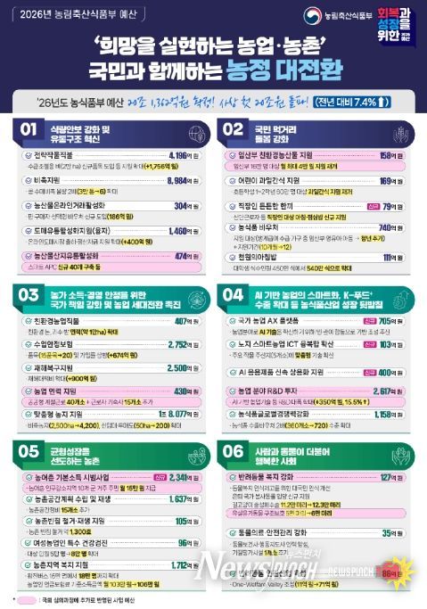 뉴스펀치 조평훈 기자 | 농림축산식품부는 2026년 예산이 국회 심의를 통해 정부안(20조 350억원) 대비 1,012억원 증액된 20조 1,362억원으로 확정됐다고 밝혔다. 이는 2025년 대비 7.4%(1조 3,946억원) 증가된 규모로, 농어촌 기본소득 시범사업, 임산부 친환경농산물 지원, 공공형 계절근로 등 주요 사업에 필요한 예산이 추가 반영됐다.