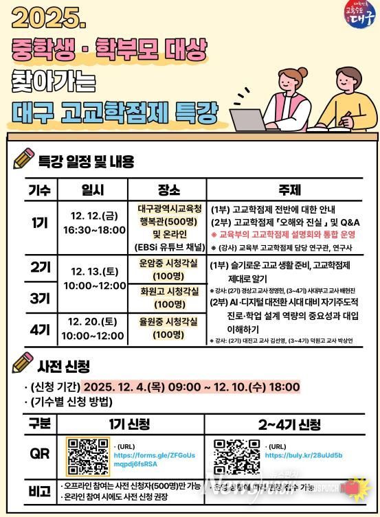 뉴스펀치 조평훈 기자 | 대구시교육청은 중학생과 학부모가 고교학점제를 쉽게 이해할 수 있도록 12월 12일, 13일, 20일 등 3일 동안‘2025. 찾아가는 대구 고교학점제 특강’을 운영한다.
