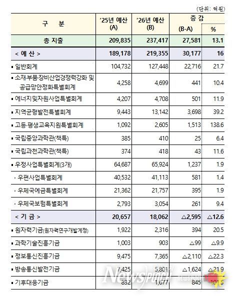 뉴스펀치 조평훈 기자 | 과학기술정보통신부는 정부안 대비 746억원 증액된 총 23조 7,417억원 규모의 과기정통부 2026년도 정부 예산 및 기금운용계획이 12월 2일 국회 본회의 의결을 통해 최종 확정됐다고 밝혔다.