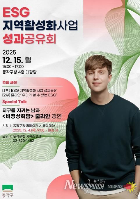 뉴스펀치 김완규 기자 | 동작구가 오는 15일 오후 3시 구청 4층 대강당에서 ‘ESG 지역활성화사업 성과공유회’를 개최한다고 밝혔다.