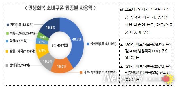 업종별 사용은 대중음식점(40.3%, 3조 6,419억원), 마트·식료품(16.0%, 1조 4,498억원), 편의점(10.8%, 9,744억원), 병원·약국(8.8%, 7,952억원), 학원(3.7%, 3,373억원), 의류·잡화(3.6%, 3,294억원) 순으로 이루어졌다.