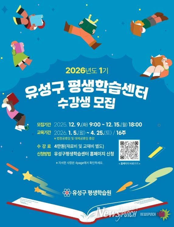 뉴스펀치 김길룡 기자 | 대전 유성구는 오는 9일부터 15일까지 구암평생학습센터와 전민평생학습센터에서 운영하는 ‘2026년도 1기 평생학습센터’ 수강생을 모집한다.