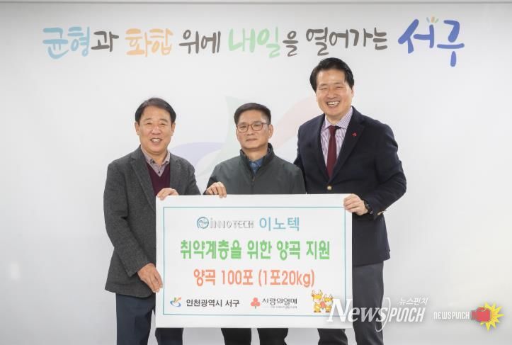 뉴스펀치 김길룡 기자 | 인천 서구는 (주)이노텍로부터 지난 4일 어려운 이웃을 위한 양곡(20kg) 100포를 전달받았다고 밝혔다.