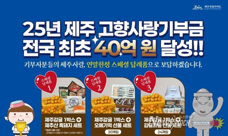 양기철 제주도 기획조정실장은 “제주를 향한 따뜻한 마음으로 기부에 동참해주신 모든 분들께 깊이 감사드린다”며 “10만원 기부액까지 전액 세액공제가 되는 제주고향사랑기부제에 동참해 연말 한정 스페셜 감귤 패키지 상품을 받아가길 바란다”고 말했다.
