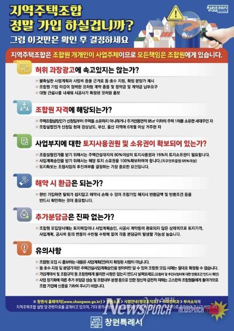 뉴스펀치 김길룡 기자 | 창원특례시는 지역주택조합 사업과 관련하여 최근 피해 민원이 발생하고 있으며, 이러한 피해는 주로 민‧형사상 고소, 고발 및 소송 등으로 이어져 재산 피해뿐만 아니라 정신적 피해까지 입는 경우가 다수이므로 가입 시 각별한 신중을 기할 것을 시민들에게 당부했다.