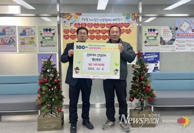 뉴스펀치 김길룡 기자 | 의정부시 고산동주민센터는 12월 4일 전주이씨 선성군파 명산종중이 고산동 저소득층을 위한 성금 50만 원을 전달하며 ‘100일간 사랑릴레이 배턴 잇기’에 동참했다고 밝혔다.