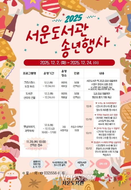 뉴스펀치 김길룡 기자 | 인천 계양구 서운도서관은 송년의 달을 맞아 어린이부터 성인까지 함께 즐길 수 있는 다양한 연말 프로그램을 운영한다고 밝혔다.