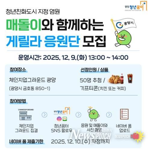 뉴스펀치 김길룡 기자 | 광양시는 청년친화도시 지정에 대한 시민 공감대를 확산하고 청년 참여 분위기를 조성하기 위해 오는 12월 9일 오후 1시부터 2시까지 체인지업그라운드 광양 일대에서 ‘매돌이와 함께하는 청년친화도시 지정 염원 게릴라 응원단’을 운영한다고 5일 밝혔다.