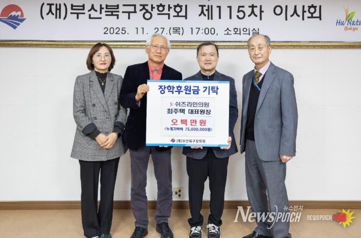 뉴스펀치 김길룡 기자 | 부산 북구는 지난 11월 27일, 쉬즈라인의원 최주택 대표원장이 (재)부산북구장학회에 장학기금 500만 원을 기탁했다고 밝혔다.